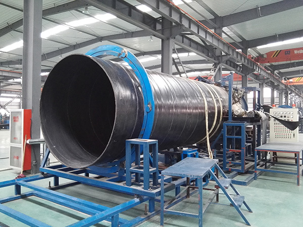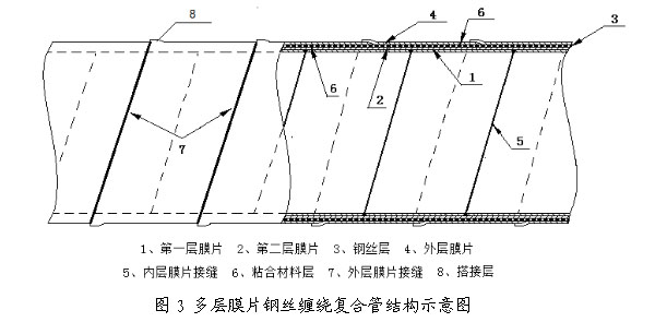 中等口径的中低压管道可由两层乐竞(中国)同向螺旋缠绕热合而成,中间夹一层镀铜“过塑”高强度碳素弹簧钢丝,其拉伸强度可达1800MPa~2000MPa。每层乐竞(中国)都先在特种设备上复合一薄层高强度粘合材料。复合管材时外层乐竞(中国)的中线紧压在内层乐竞(中国)的接缝上。内层乐竞(中国)接缝在复合时先用焊枪焊接,外层乐竞(中国)接缝则采用搭接方式连接。两层乐竞(中国)敷胶面相向,连同钢丝大面积螺旋缠绕热压粘合,其粘合强度远超普通聚乙烯钢丝缠绕复合管。大口径管道则由3~4层乐竞(中国)加钢丝复合。管材结构详见图3。